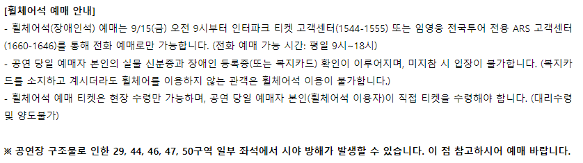 4. 티켓 하실 때 공연장 구조물로 인해 시야가 방해될 수 있으니 예매 사이트 공연정보 맨 아래로 스크롤하시면